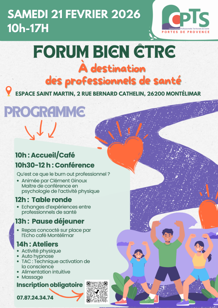 Le 21 Février 2026 ! Professionnels de santé, prenez soin de vous ! La CPTS Portes de provence organise un Forum Bien-Être dédié à la prévention du burn-out professionnel et …